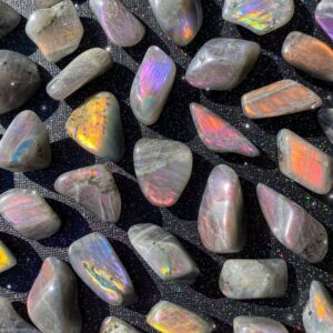 La spectrolite est une variété de labradorite provenant de Finlande, elle possède les mêmes propriétés en un peu plus fort. Elle nous